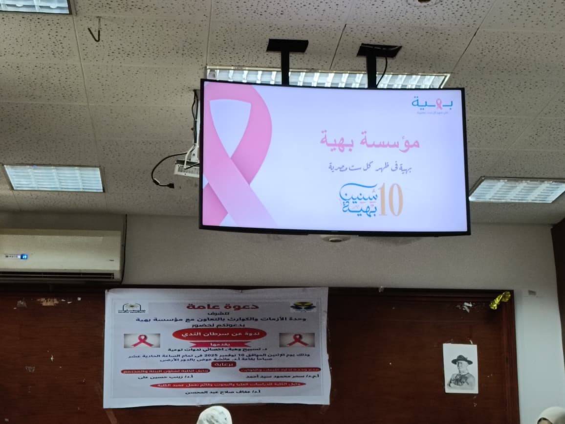 تحت رعاية السيد الأستاذ الدكتور السيد قنديل رئيس الجامعة والأستاذ الدكتور وليد السروجى نائب رئيس الجامعة لتنمية البيئة وخدمة المجتمع و تحت رعاية أ.د عفاف صلاح عبدالمحسن قائم بعمل عميد الكلية وريادة أ.د زينب حسين على وكيل الكلية لخدمة البيئة وتنمية المجتمع أ.م.د/سحر محمود مدير ووحدة الأزمات والكوارث .و في إطار جهود كلية التمريض – جامعة حلوان لنشر الوعي الصحي وتعزيز ثقافة الوقاية والكشف المبكر عن الأمراض،نظمت الكلية ندوة توعوية تحت عنوان "سرطان الثدي: الوقاية والكشف المبكر". تم تنظيم الندوة بالتعاون مع مؤسسة بهية للكشف المبكر وعلاج سرطان الثدي، وذلك يوم الإثنين الموافق 10 نوفمبر 20كلية ندوة توعوية تحت عنوان "25 في قاعة أ.د/ عائشة عوض، الدور الأرضي بكلية التمريض – جامعة حلوان.