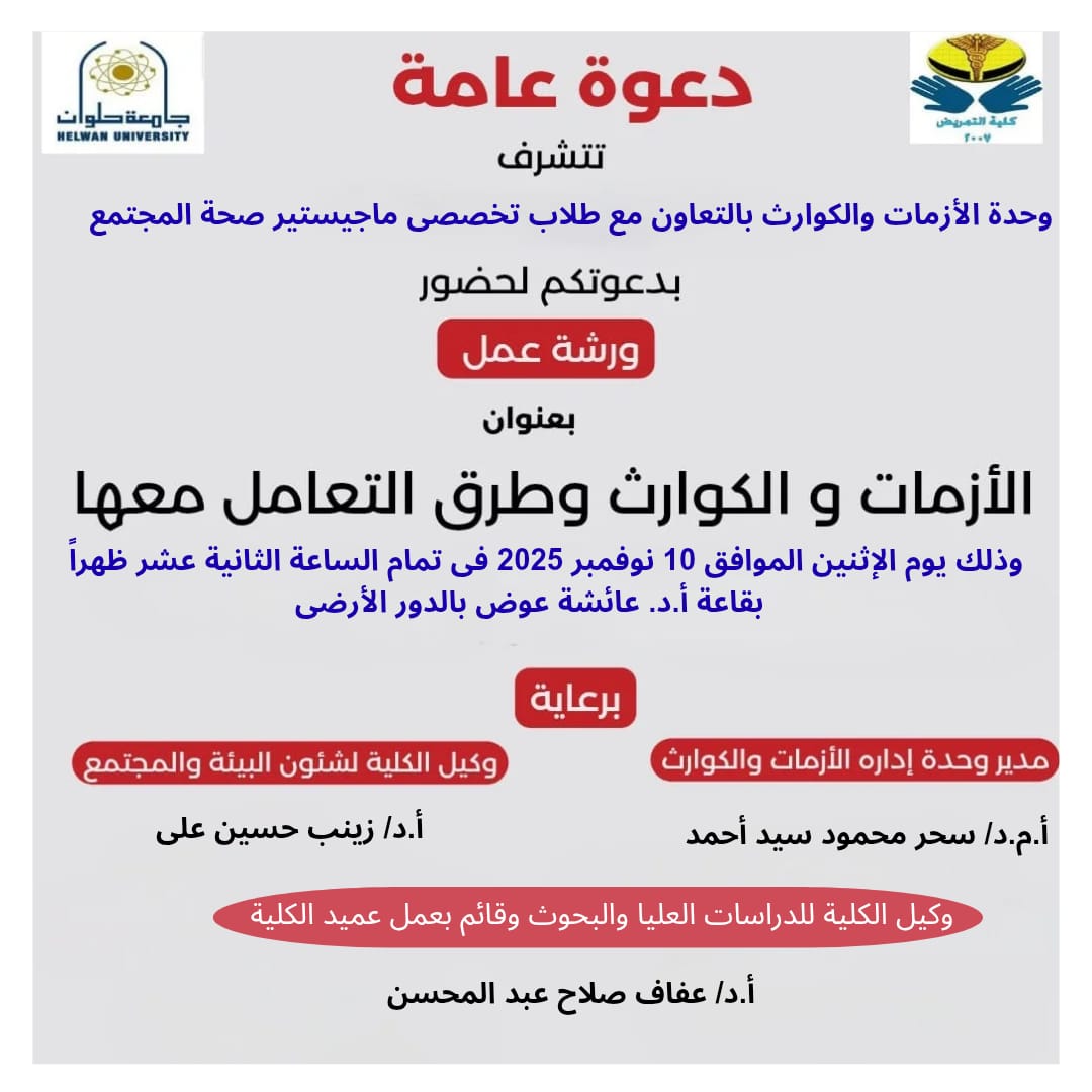 تحت رعاية السيد الأستاذ الدكتور السد قنديل رئيس الجامعة والأستاذ الدكتور وليد السروجى نائب رئيس الجامعة لتنمية البيئة وخدمة المجتمع و تحت رعاية أ.د عفاف صلاح عبدالمحسن قائم بعمل عميد الكلية وريادة أ.د زينب حسين على وكيل الكلية لخدمة البيئة وتنمية المجتمع و في إطار حرص كلية التمريض على تجهيز كوادر تمريضية مؤهلة للتعامل مع المواقف الطارئة داخل المؤسسات الصحية، نظمت الكلية ورشة عمل تدريبية بعنوان "إدارة الأزمات والكوارث وطرق التعامل معها". قدمت الورشة أ.م.د. سحر محمود سيد أحمد، مدير وحدة إدارة الأزمات والكوارث بكلية التمريض – جامعة حلوان.